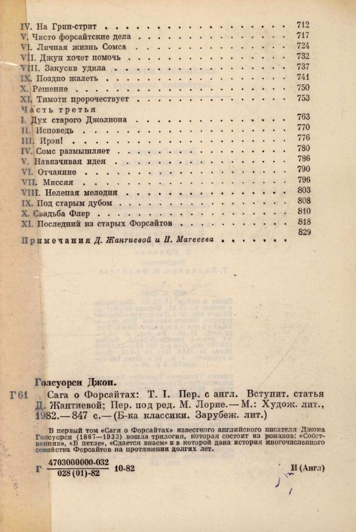 Сага о Форсайтах : в 2-х т. / Джон Голсуорси ; перевод с английского под редакцией М. Лорие ; вступительная статья Д. Жантиевой, с. 5-22 ; примечания Д. Жантиевой, Н. Матвеева ; художник В. Горяев. - Москва : Художественная литература, 1982. - 21 см. - (Библиотека классики. Зарубежная литература / редколлегия серии: Андреев Л. Г. [и др.]). Т. 1: Собственник ; Последнее лето Форсайта ; В петле ; Пробуждение ; Сдается внаем. - 1982. - 847 с., 9 л. ил. - 650000 экз.