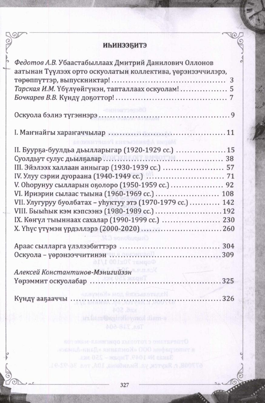 Оскуолам үйэлээх сэһэнэ : Д. Д. Оллонов аатынан Түүлээх орто оскуолатын 100 cылыгар ананар : [ахтыылар] / хомуйан оҥордулар: А. К. Алексеев, М. А. Решетникова (Мария Алексеева-Арыылы Дуйдаах) ; эппиэттээх эрэдээктэрдэр: А. Г. Аммосова, С. М. Саввина ; [киирии тыллар ааптардара: А. В. Федотов, И. М. Тарская, В. В. Бочкарев]. - Дьокуускай : Көмүөл, 2021. - 327 с., [8] л. цв. ил., портр.