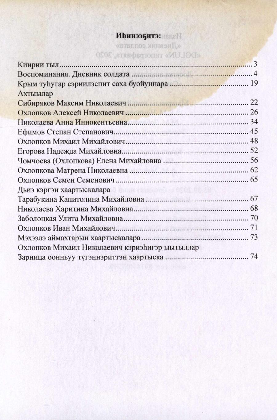 Дневник ветерана Великой Отечественной войны, уроженца Батагайского наслега Усть-Алданского улуса Михаила Николаевича Охлопкова. В сборник также вошли воспоминания о нем коллег, родных