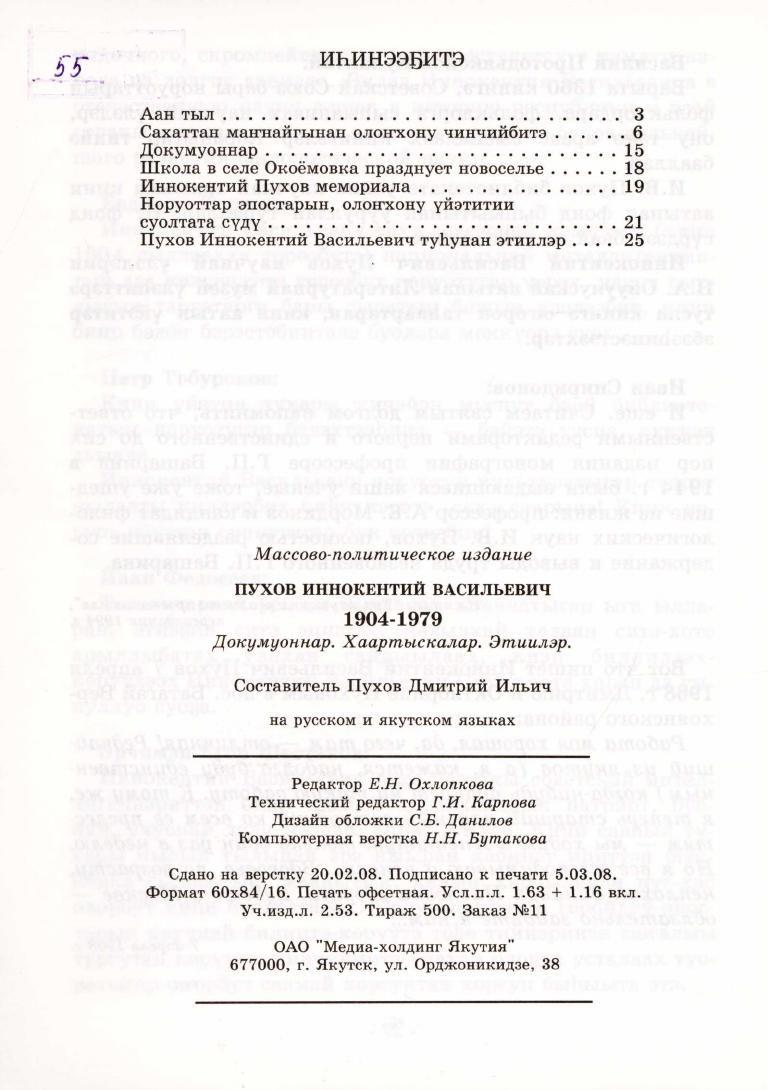Пухов Иннокентий Васильевич, 1904-1979 : докумуоннар, хаартыскалар, этиилэр / [Д. И. Пухов хомуйан, көрөн таһааттарда]. - Якутск : Медиа-холдинг "Якутия", 2008. - 27 с., [10] л. ил.