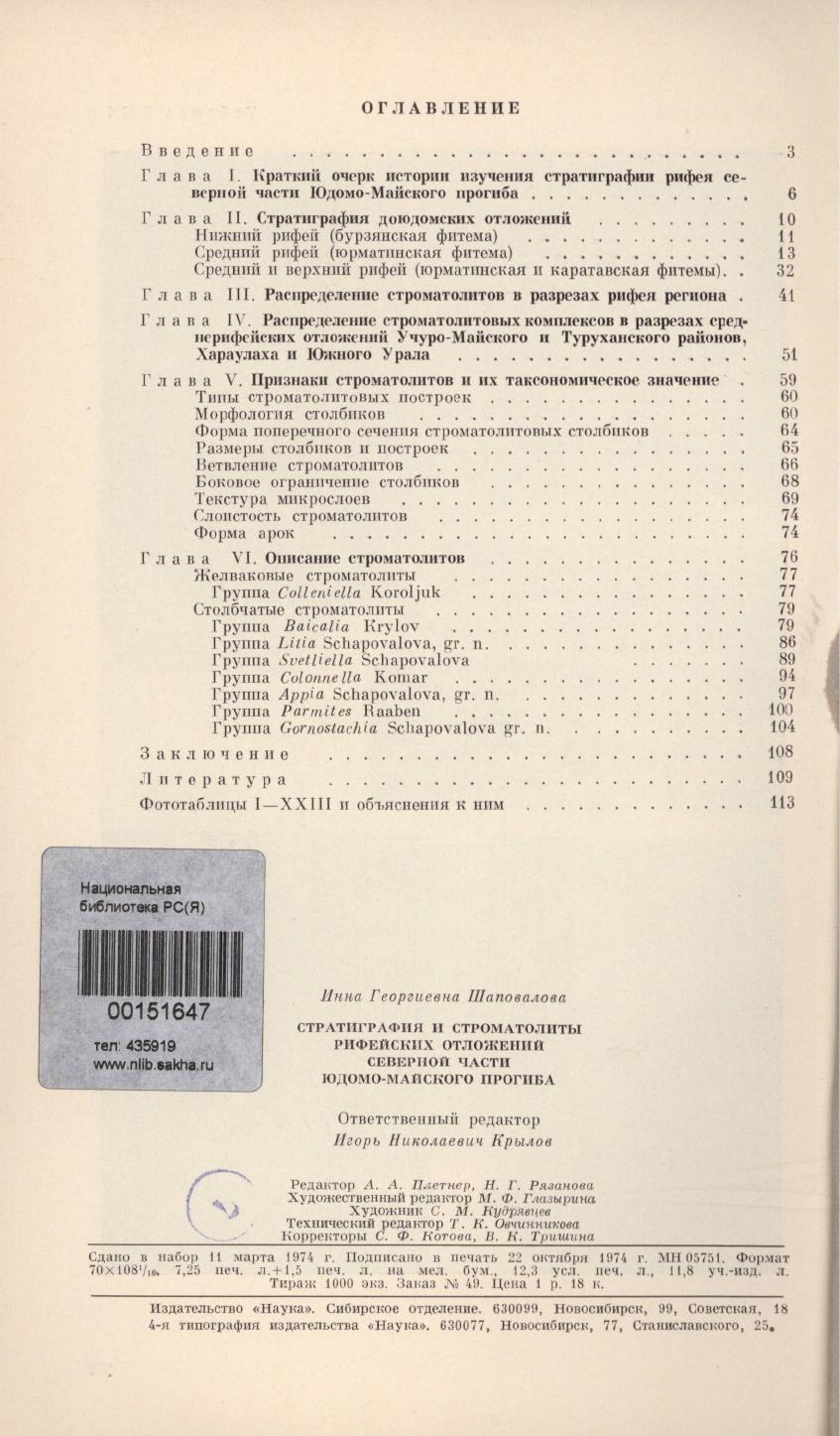 Стратиграфия и строматолиты рифейских отложений северной части Юдомо-Майского прогиба / Отв. ред. д-р геол.-минерал. наук И.Н.Крылов ; АН СССР, СО, ЯФ, Ин-т геологии. - Новосибирск : Наука, 1974. - 140 с.