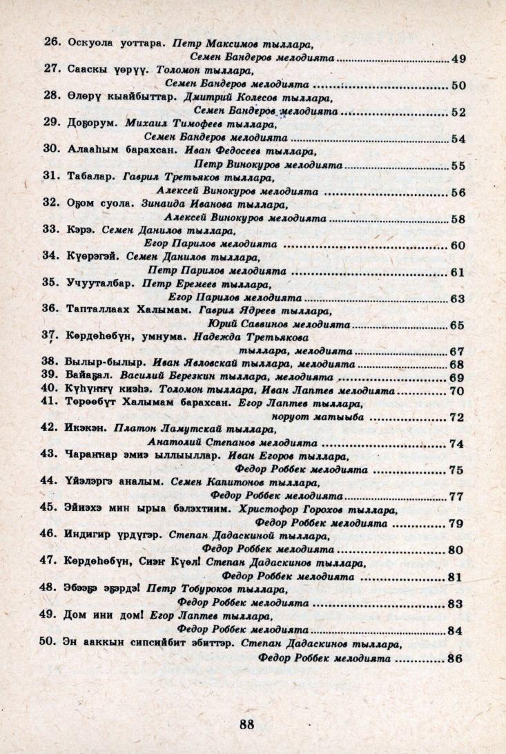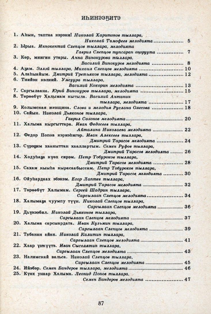 Эйиэхэ мин ырыа бэлэхтиим : [ырыанньык] / Республиката норуот айымньытын дьиэтэ, Орто Халыма улууһун дьаһалтатын культураҕа отдел, Орто Халыма мелодистарын "Кылыһах" түмсүүтэ ; [хомуйан оҥордо А. Н. Семенов ; музыкальнай редактор А. Н. Сазонов ; киирии тыл автор Степан Дадаскинов]. - Дьокуускай : Ситим, 1994. - 88 с.