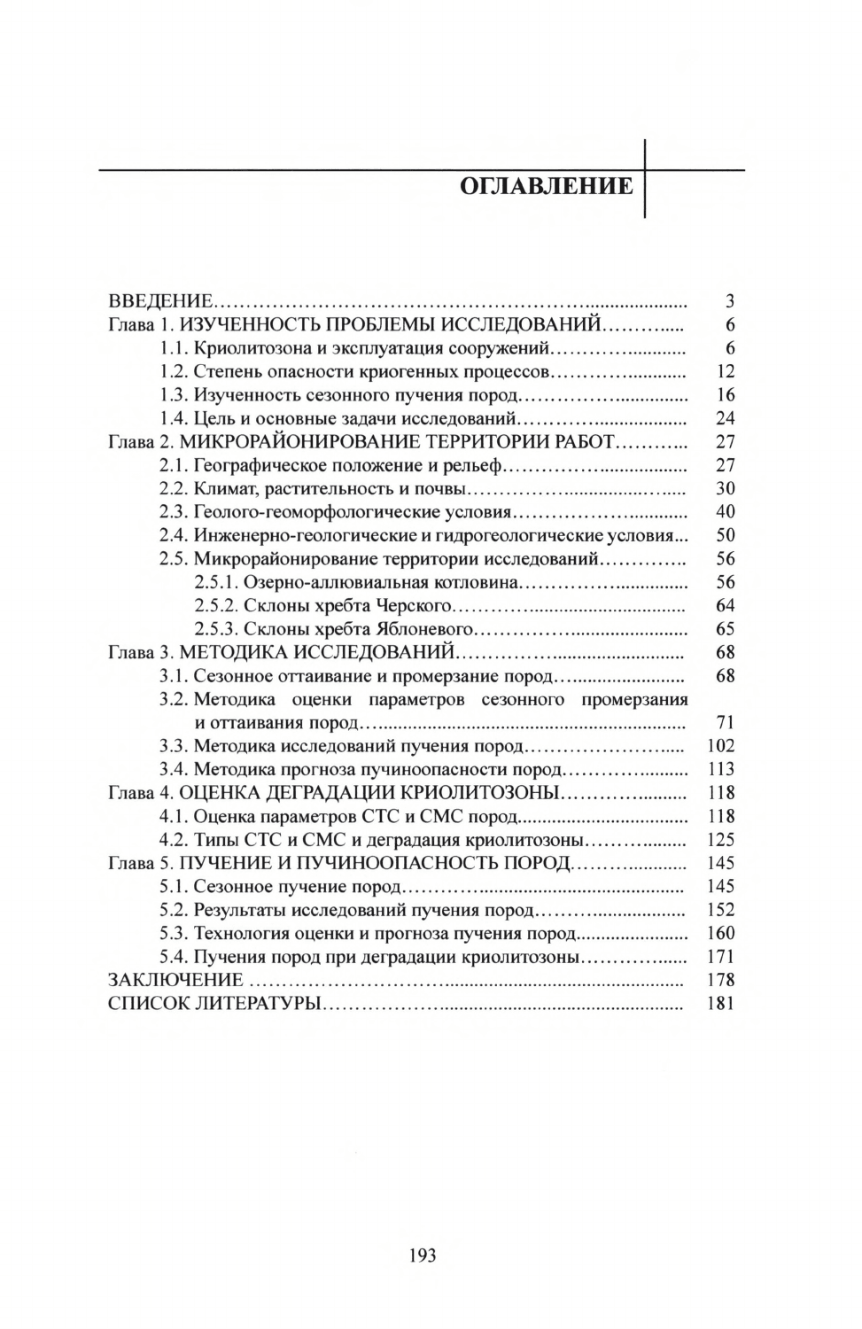 В монографии на основе существующих и разработанных методик исследований выполнено микрорайонирование урбанизированного участка южной периферии криолитозоны Центрального Забайкалья, оценено влияние различных факторов природной среды на распространение, мощность и температурный режим многолетнемерзлых пород и пород слоя сезонного оттаивания и промерзания. Представлены результаты и дан анализ натурных и лабораторных экспериментальных исследований пучения пород. Составлены карты типов сезонного промерзания и оттаивания и карты изменения пучиноопастности пород в период глобального изменения климата (середина XX в. - начало XXI в.). Показано, что деградация криолитозоны на южной периферии Забайкалья за этот период составила более 30-40 % при существенном увеличении интенсивности пучения пород