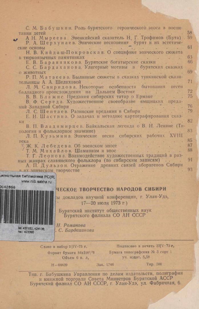 Эпическое творчество народов Сибири : тезисы докладов научной конференции, Улан-Удэ, 17-20 июля 1973 г. / [редколлегия: А. И. Баландин, Е. В. Баранникова, Д. Д. Лубсанов (ответственный редактор) и др.] . - Улан-Удэ : [б. и.], 1973. - 96 с.