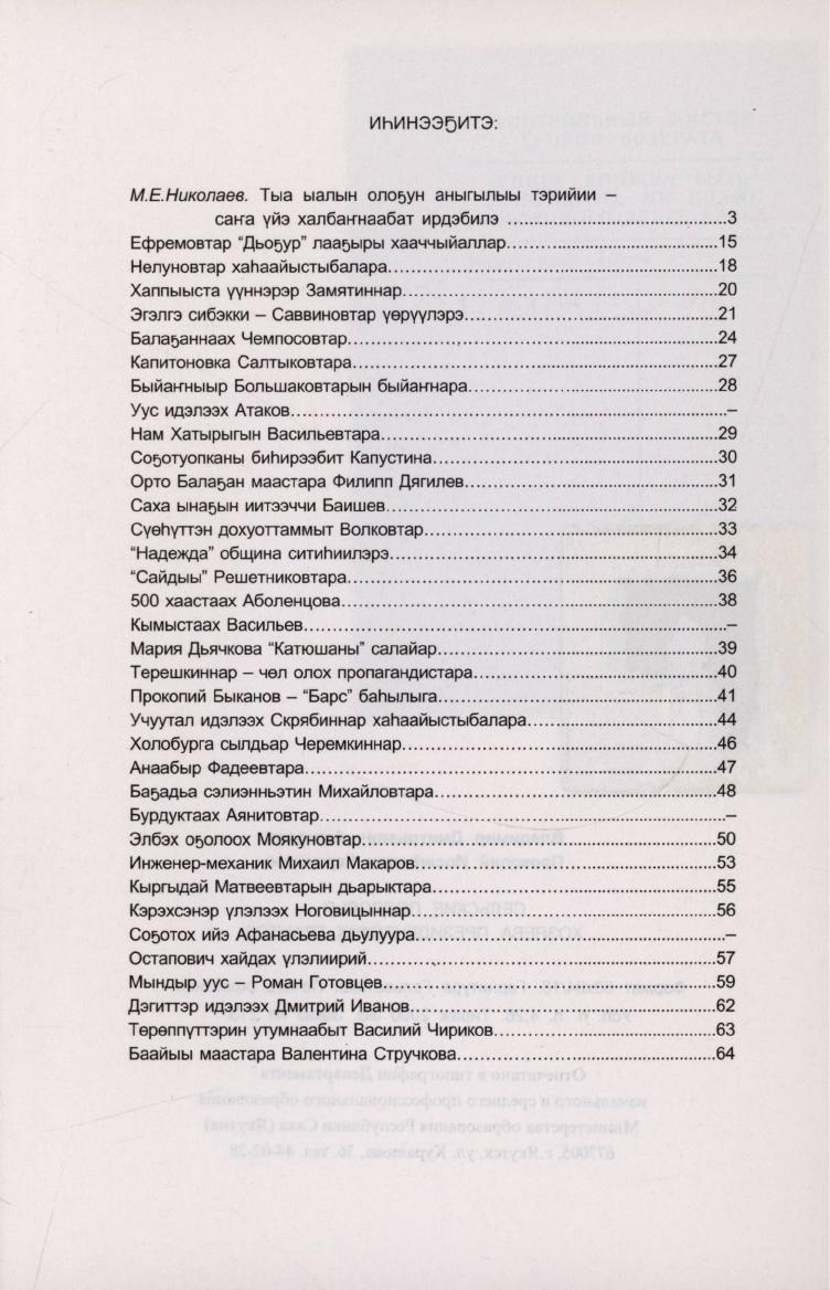 Тыа сирин ыаллара - президент гранын хаһаайыннара : дьиэ кэргэн экономикатын салгыы сайыннарыыга аналлаах республикатын бастакы съезд матырыйаалынан / Дьиэ кэргэн уонна оҕо-аймах дьыалаларыгар Саха Республикатын Президенин иһинэн комитета ; хомуйан оҥордулар, редактордар: В. Д. Аммосов, П. И. Караканов. - Дьокуускай : [и. с.], 2000. - 65 с.
