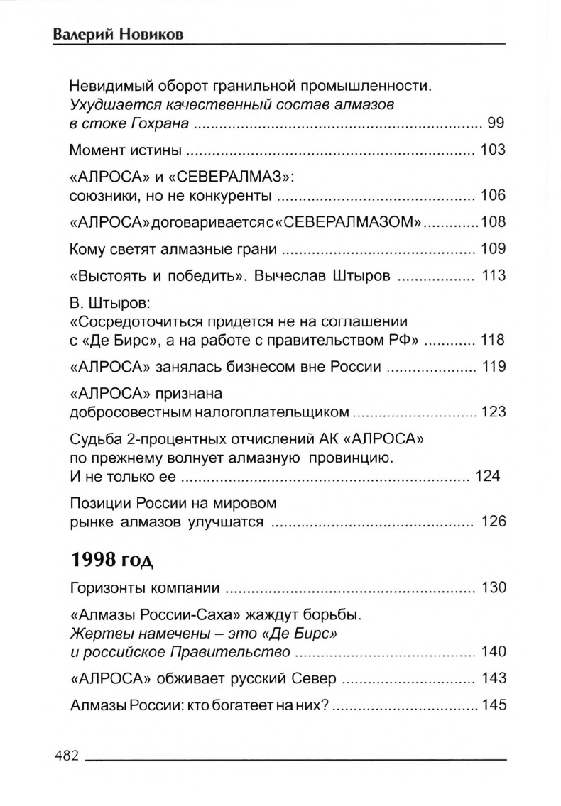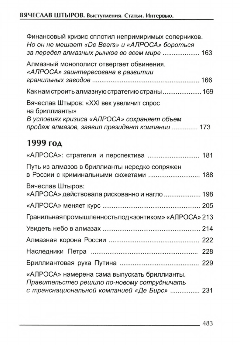 Книга представляет собой сборник статей, выступлений и интервью за период 1995-2002 гг. президента акционерной компании "Алмазы России-Саха" ("Алроса") В. А. Штырова. Материалы книги сквозь призму сложных и противоречивых процессов в жизни Российской Федерации и Республики Саха (Якутия) в тот период дают объемное представление о борьбе за сохранение выживания алмазодобывающей промышленности страны, становлении акционерной компании "Алроса", формировании основных принципов ее деятельности, структуры, системы управления, традиций, идеологии дальнейшего развития