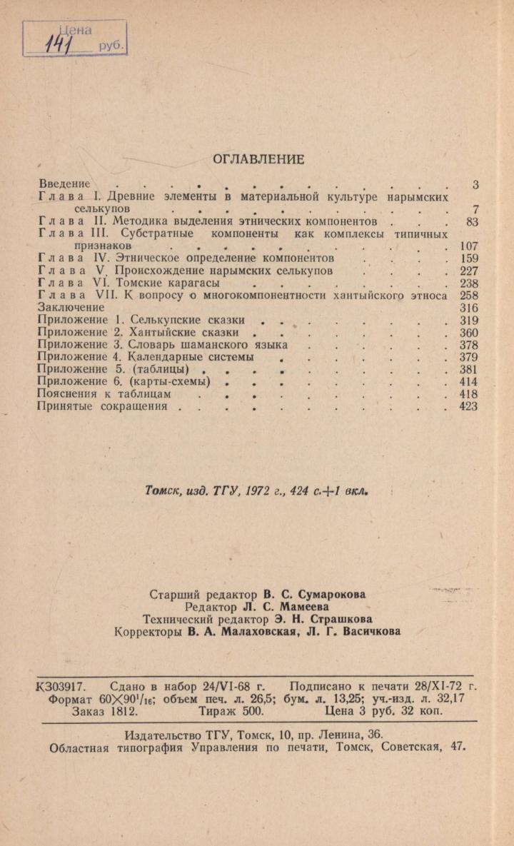 Происхождение селькупов / Г. И. Пелих ; Томский государственный университет им. В. В. Куйбышева. - Томск : Издательство Томского университета, 1972. - 420, [4] с.