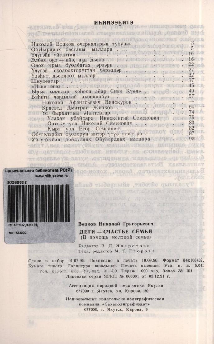 Оҕо-дьиэ кэргэн дьоло : эдэр дьиэ кэргэҥҥэ көмө / Н. Г. Волков ; Үөрэх үлэһиттэрин идэлэрин үрдэтэр институт, Саха сиринээҕи норуот педагогикатын ассоциацията. - Дьокуускай : НИПК "Сахаполиграфиздат", 1996. - 96 с.