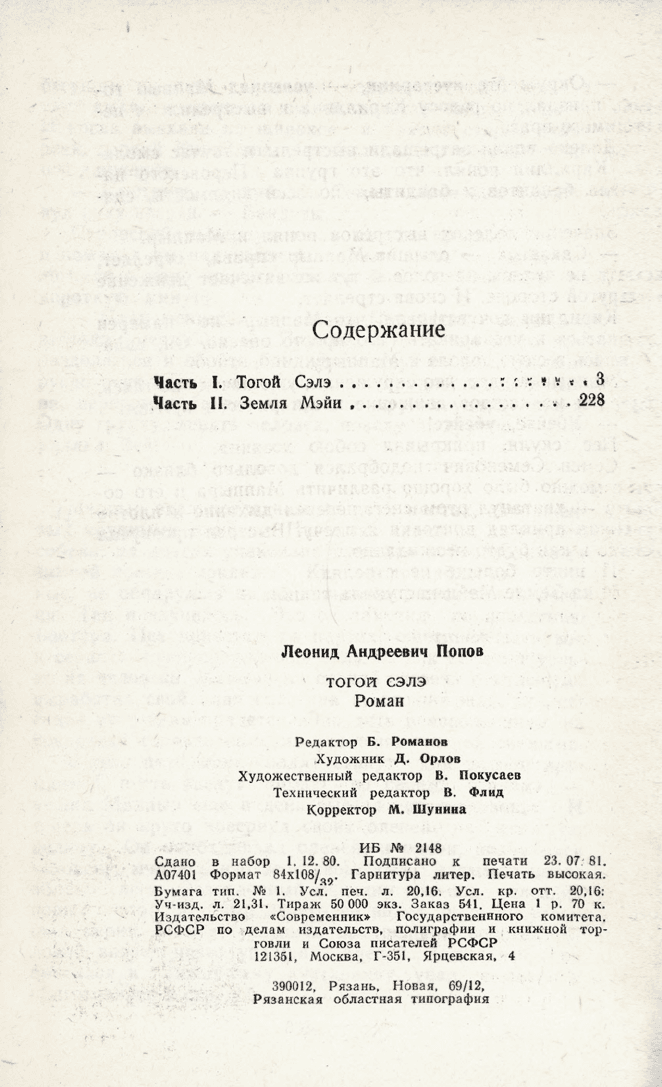 Роман известного якутского поэта и прозаика Леонида Попова "Тогой Сэлэ" воссоздает события двадцатых годов, когда после разгрома Колчака и интервентов в глухих местах Якутии стали возникать и укрепляться ревкомы молодой Советской власти. В центре романа - люди и события улуса Тогой Сэлэ, борьба за становление народной власти. В остросюжетном повествовании зримо встают картины и люди грозового времени