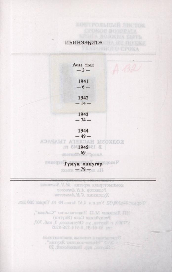 Тыараһа холкуостара, 1941-1945 : Таатта оройуонун "Коммунист" хаһыат матырыйаалларынан / [хомуйан оҥордо Чехордуна Е. П. ; редакционнай бөлөх: Белина А. В., Попова А. В., Бугаева А. В.]. - Дьокуускай : Сайдам, 2010. - 85, [2] с.