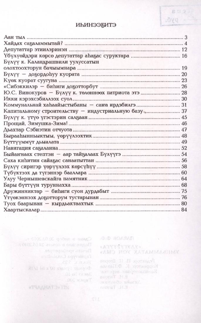 "Улугурууга" умньамматах уон сыл" / Ф. Ф. Павлов ; [редактор П. Н. Егоров ; аан тыл автора К. Е. Павлов]. - Бүлүү : Стандарт, 2010. - 112 с.