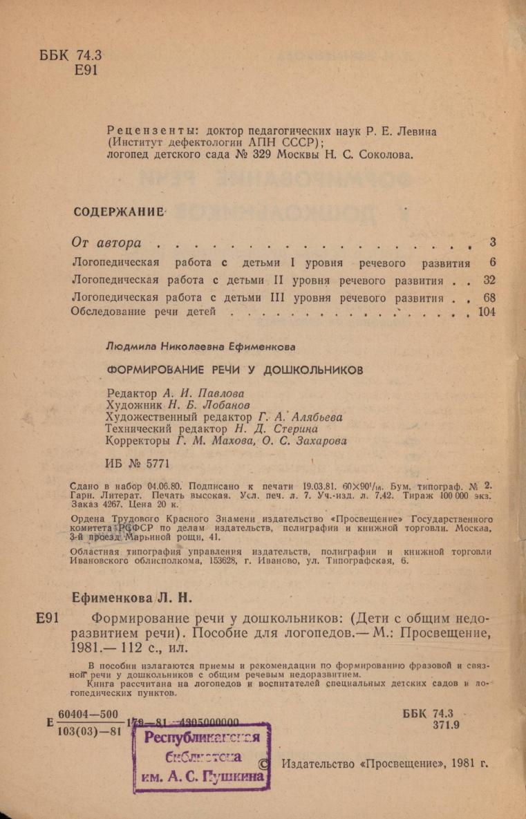 Н. Формирование речи у дошкольников /Дети с общим недоразвитием речи/ : Пособие для логопедов. - М : Просвещение, 1981. - 112 с.