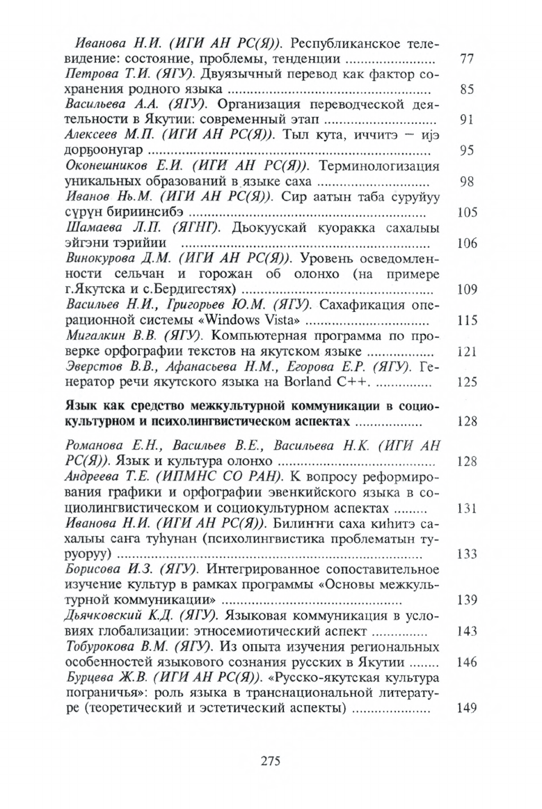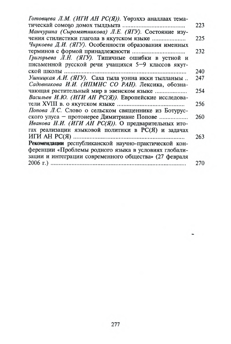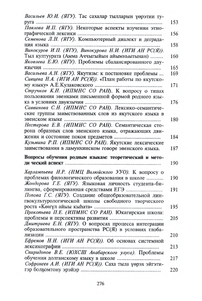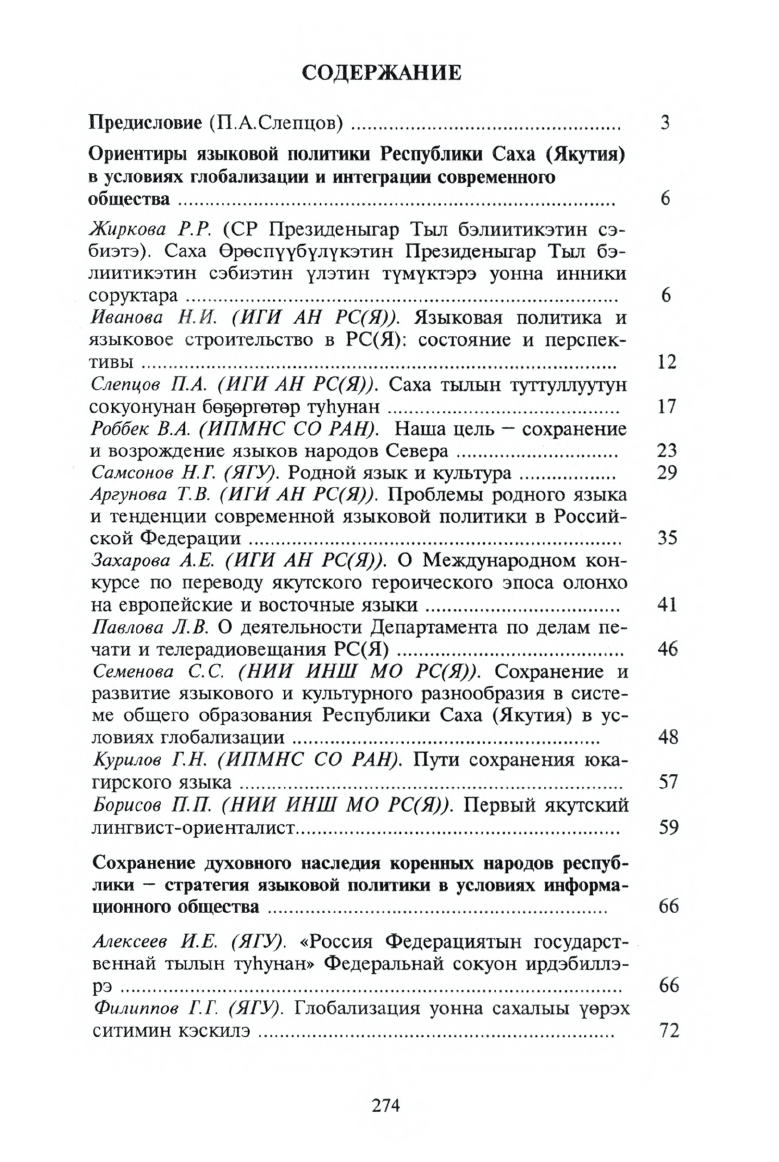 Проблемы родного языка в условиях глобализации и интеграции современного общества: сборник научных статей / Акад. наук Респ. Саха (Якутия), Ин-т гуманит. исслед., Совет по языковой политике при Президенте РС(Я); [редкол.: д.ф.н. П. А. Слепцов (отв. ред.) и др.; авт. предисл. д.ф.н., проф. П. А. Слепцов]. - Якутск: ИГИ АН РС(Я), 2007. - 277 с.