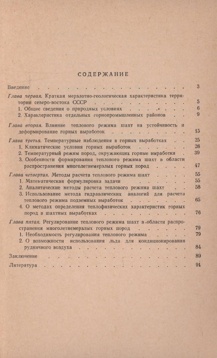 В данной работе обобщаются результаты исследований по изучению тепловых процессов в подземных выработках, разработке методов их расчета, выявлению зависимости между температурой и устойчивостью массива горных пород, окружающего выработку, а также приводятся теплофизические предпосылки для применения льда в целях регулирования теплового режима шахт. Поставленные задачи решены главным образом на примере угольных и россыпных месторождений северо-восточных районов СССР, характеризующихся наиболее суровыми климатическими и мерзлотными условиями. Для изучения теплового режима шахт и его влияния на устойчивость горных выработок использованы в основном наблюдения, проведенные под руководством автора на горнодобывающих предприятиях Якутского совнархоза (шахты Сангарская, Джебарики-Хая, Чульманская, Кангаласская) и треста Арктикуголь (Согинская шахта), а также аналитические расчеты и тепловое моделирование (метод гидравлических аналогий)