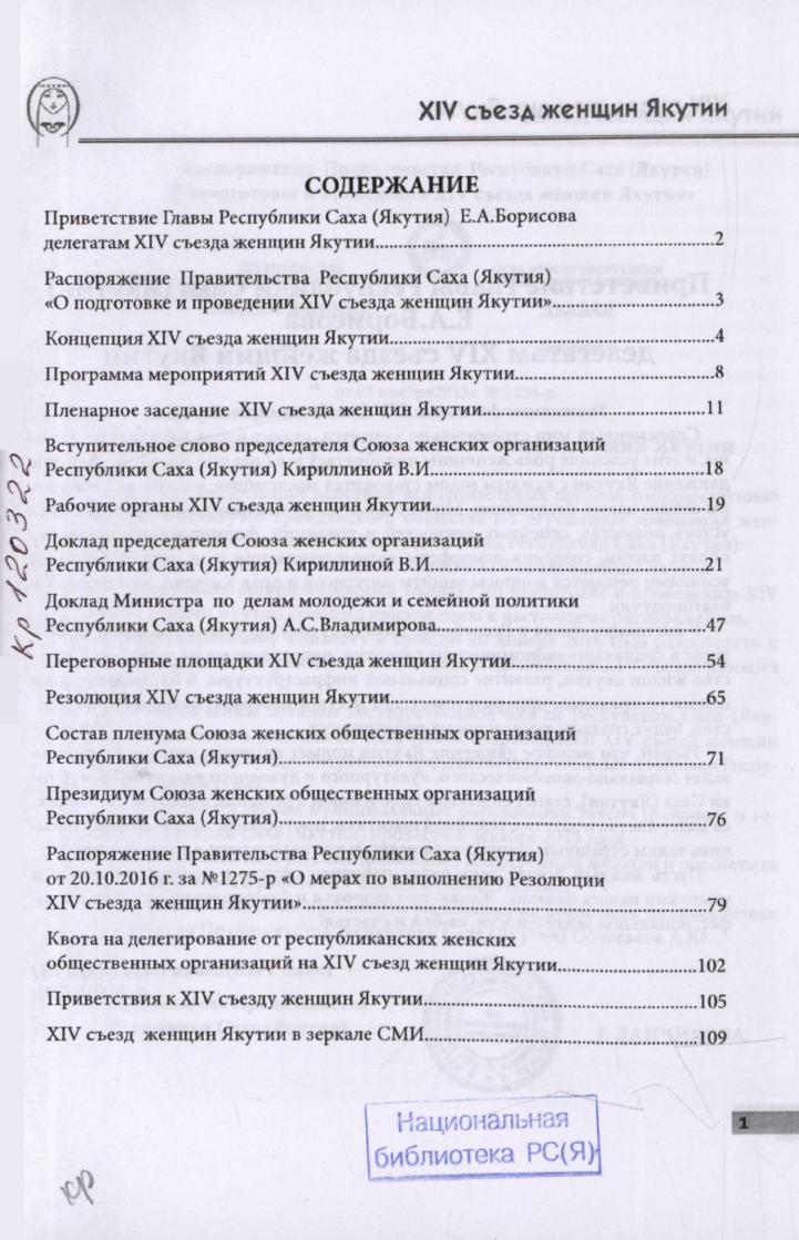 XIV съезд женщин Якутии / [составители: А. Е. Андреева, Ю. А. Дорофеева, А. В. Пермякова и др. ; под общей редакцией: А. С. Владимирова, В. И. Кириллиной]. - Якутск : [б. и.], 2016. - 122 с., [8] л. ил., портр.