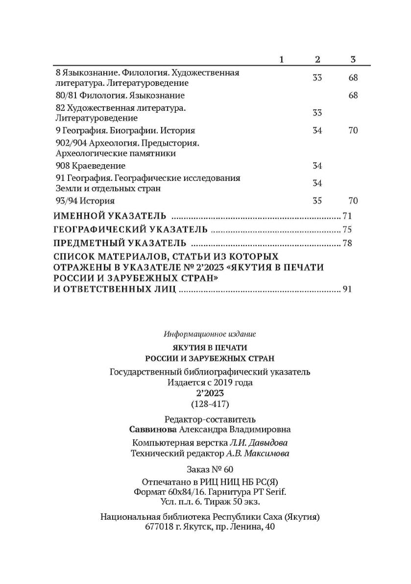 Якутия в печати России и зарубежных стран : государственный библиографический указатель = Саха Өрөспүүбүлүкэтин туһунан Арассыыйа уонна тас дойдулар таһаарыылара : судаарыстыбаннай библиографическай ыйынньык / Министерство культуры и духовного развития Республики Саха (Якутия), Национальная библиотека Республики Саха (Якутия), Центр обеспечения информационными ресурсами. - Якутск : СРИД НБ РС(Я), 2019- . 2023, N 2 (128-417). - 2024. - 1 файл (95, [1] с.