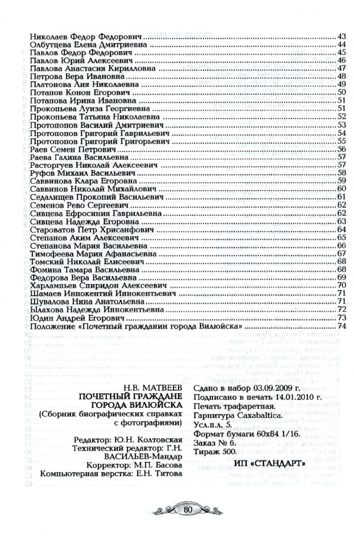 Почетные граждане города Вилюйска / [Матвеев Н. В. ; редакторский совет: Винокуров С. Н. и др.]. - Вилюйск : ЧП Титов, 2009. - 80 с.