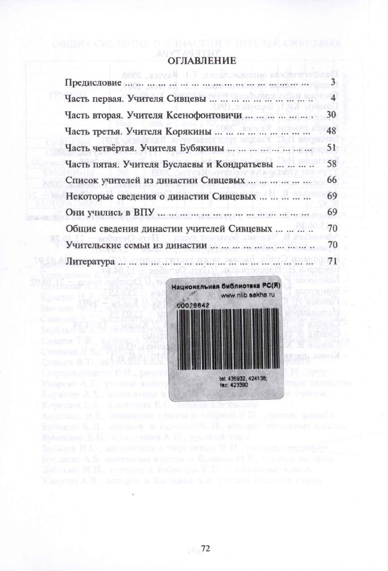 Династия учителей Сивцевых / Р. М. Бандерова, Н. С. Бандеров. - Вилюйск : Полиграф, 2005. - 72 с. : табл., портр. ).