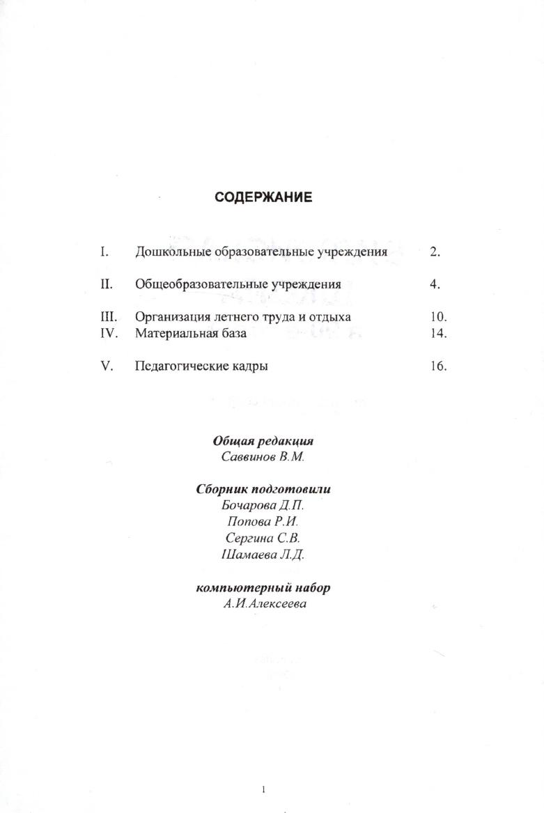 Статистический сборник состоит из пяти разделов: Дошкольные образовательные учреждения; Общеобразовательные учреждения; Организация летнего труда и отдыха; Материальная база; Педагогические кадры