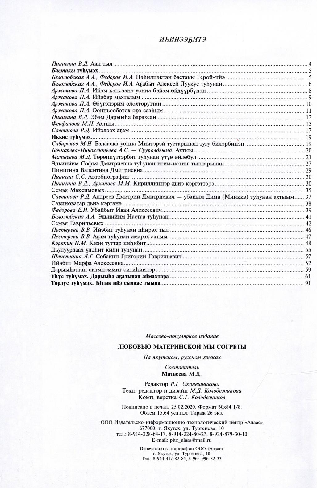 Ытык Ийэ сылаас тыына - сомоҕо күүс : [ахтыылар] / хомуйан оҥордулар: М. Д. Матвеева, В. В. Пестерева ; [аан тылы суруйда В. Д. Пинигина]. - Дьокуускай : Алаас, 2022. - 228 с.
