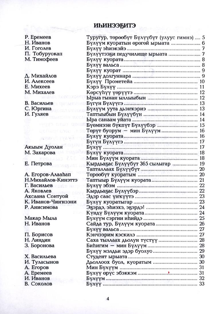 Туойабын төрөөбүт Бүлүүбүн! : [хоһооннор хомуурунньуктара / хомуйан оҥордо Н. И. Николаева ; аан тылы суруйда Н. Иванова]. - Бүлүү : Улуус типографията, 2009. - 32 с.