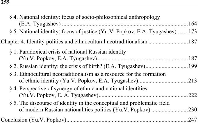 Попков, Ю. В. Этнокультурный неотрадиционализм и идентичность в современных социокультурных трансформациях : [монография] / Ю. В. Попков, Е. А. Тюгашев ; [рецензенты: Л. В. Анжиганова, Ч. К. Ламажаа] ;Министерство науки и высшего образования Российской Федерации, Институт философии и права Сибирского отделения Российской академии наук, Новосибирский государственный технический университет. - Новосибирск : Издательство, 2020. - 255 с. : табл. - ISBN 978-5-7782-4153-4. - 300 экз.