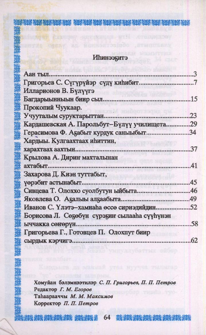 Иһирэх тыл : [ахтыылар] / хомуйан бэлэмнээтилэр: С. П. Григорьев, П. П. Петров ; редактор Г. М. Егоров. - Дьокуускай : [и. с.], 1998. - 64 с.