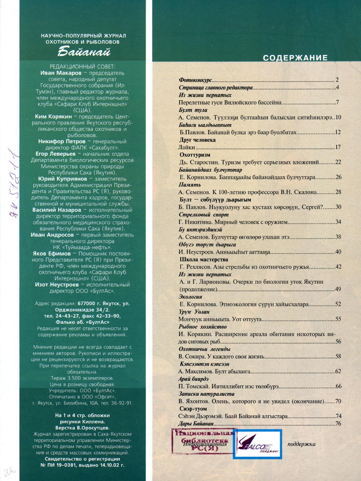 - 2. Байанай: научно-популярный журнал охотников и рыболовов. булчуттар уонна балыксыттар сурунааллара, 2003, №3 (6)