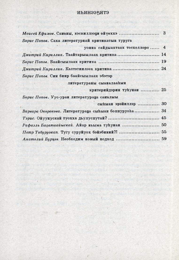 Саха литературатын саҥалыы көрүү : литературнай-критическэй ыстатыйалар / Саха республикатын суруйааччыларын союһа, Саха республикатын үөрэҕин министерствота ; редактор Б. Попов. - Дьокуускай : Ситим, 1994. - 62, [2] с.