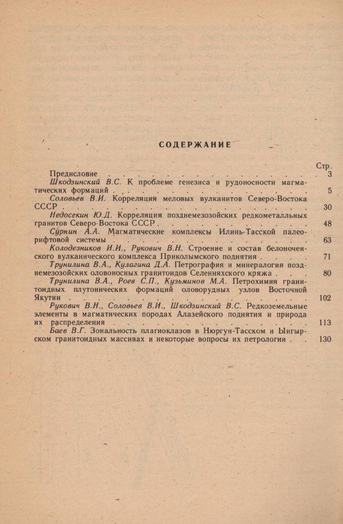 Приводятся новые данные по магматизму Восточной Якутии - расчленению и корреляции меловых вулканитов; по петрохимии, геохимии, минералогии, петрологии, времени образования и тектонической природе некоторых мезозойских гранитоидов; по составу и условиям формирования мезозойских магматических комплексов Илинь-Тасской палеорифтовой системы и палеозойских базальтов Приколымского поднятия. На основе новых петрологических и планетологических данных рассмотрена проблема генезиса и рудоносности магматических формаций и природа главных закономерностей распределения редкоземельных элементов а магматических породах