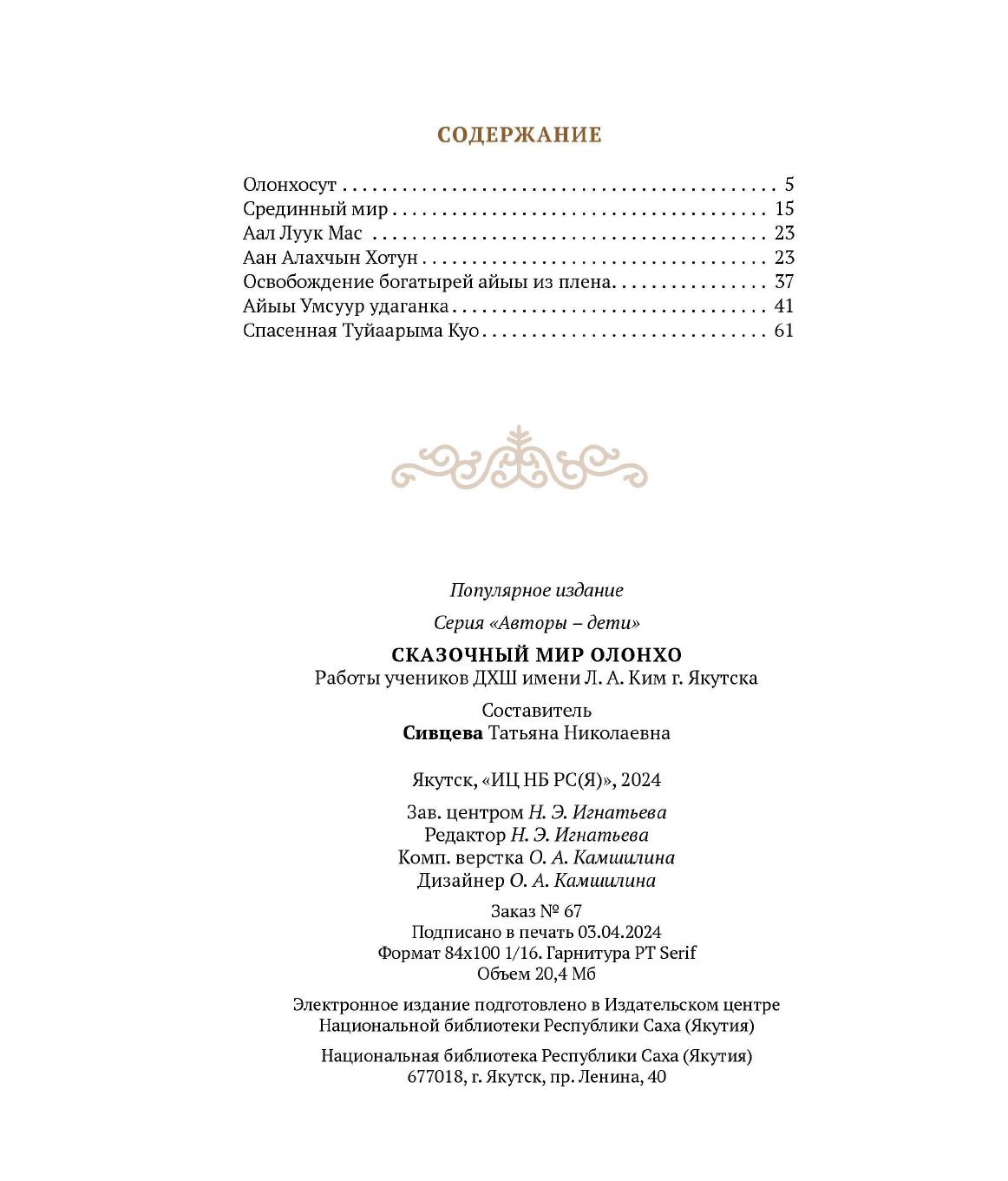 Сказочный мир олонхо : работы учеников ДХШ имени Л. А. Ким г. Якутска / Филиал НБ РС(Я) "ДТК - центр чтения", Издательский центр Национальной библиотеки Республики Саха (Якутия) ; составитель Т. Н. Сивцева ; [предисловие Г. К. Марковой]. - Якутск : ИЦ НБ РС(Я), 2024. - 1 файл (62, [2] с.