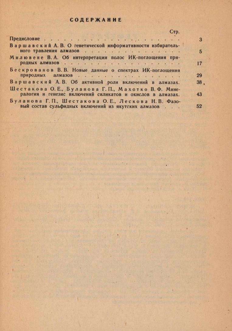В сборнике помещены статьи, в которых приводятся и анализируются новые данные по оптическим свойствам, минералогии, примесному составу природных алмазов и вещественному составу твердых минеральных включений в них. Предлагается существенно новая интерпретация И К и УФ-спектров поглощения; обсуждается механизм избирательного растворения; уточняются минеральные парагенезисы алмазов; показано, что по частоте встречаемости включения-сульфиды конкурируют с включениями окислов. Сборник рассчитан на физиков, минералогов и геологов, занимающихся алмазными проблемами