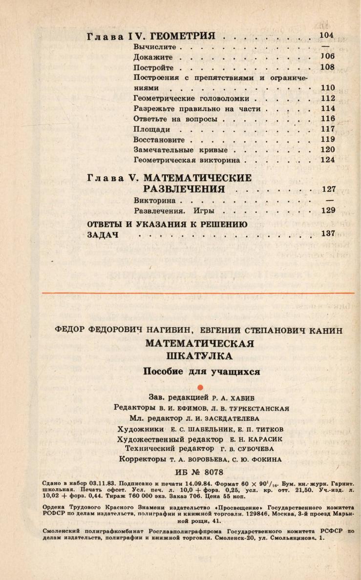 Математическая шкатулка : Пособие для учащихся / Ф. Ф. Нагибин, Е. С. Канин. - 4-е изд., перераб. и доп. - Москва : Просвещение, 1984. - 160 с.