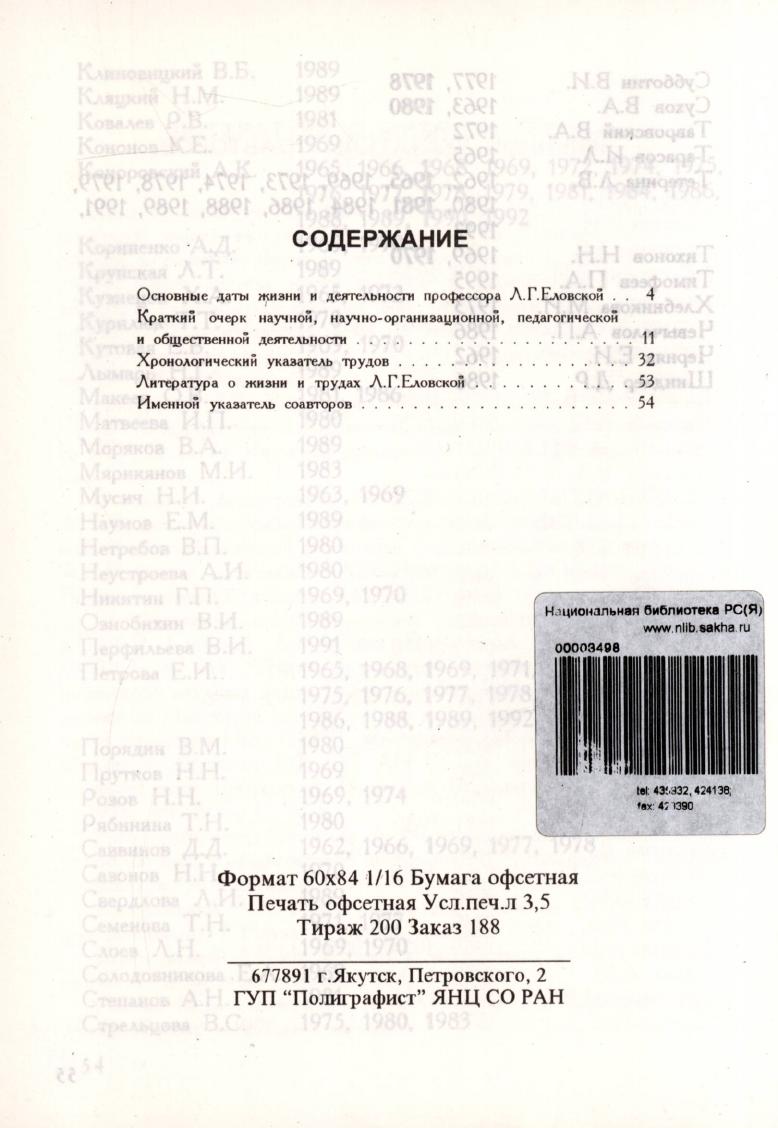 Биобиблиографический указатель заслуженного деятеля науки Якутской АССР и Российской Федерации, профессора Л. Г. Еловской включает краткий очерк научной, научно-организационной, педагогической и общественной деятельности, хронологический указатель трудов Л. Г. Еловской с 1949 по 1996 гг., а также вспомогательные указатели