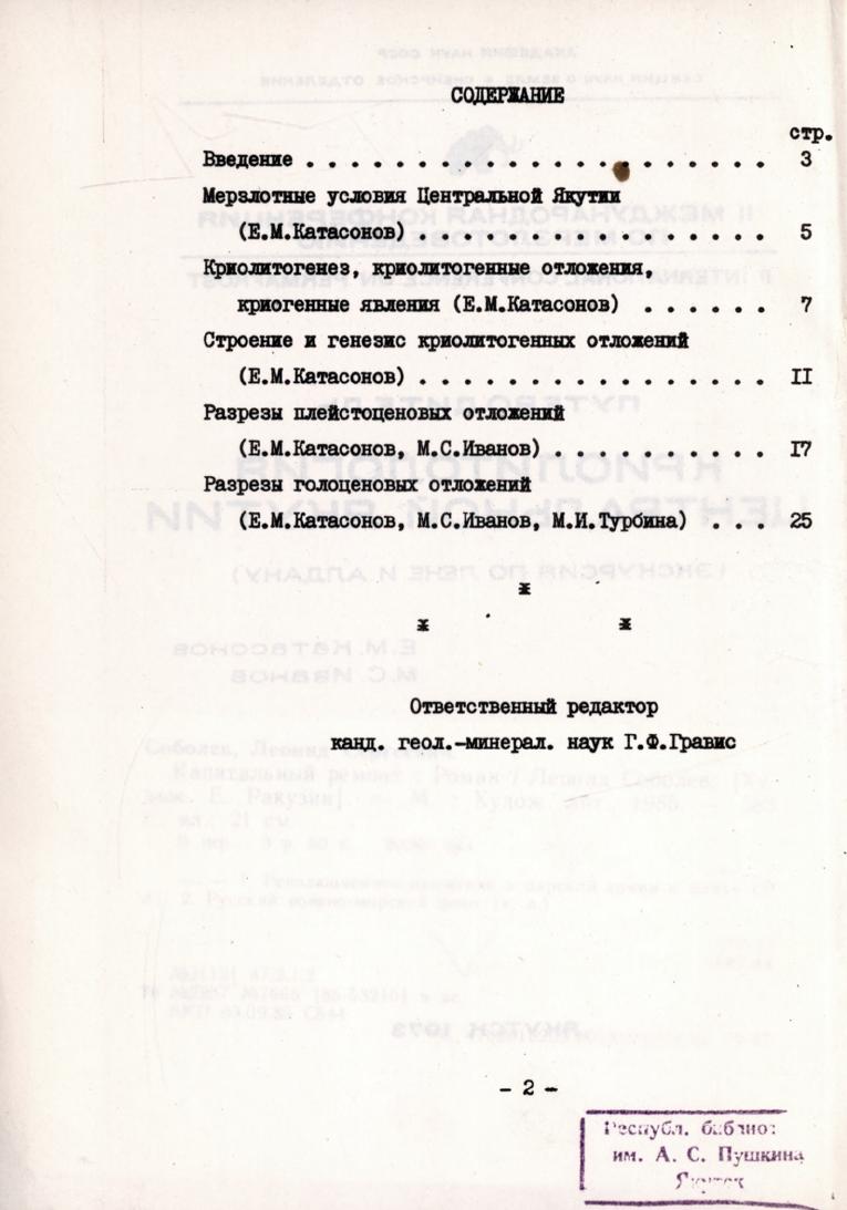 Криолитология Центральной Якутии : (экскурсия по Лене и Алдану) : путеводитель / Е. М. Катасонов, М. С. Иванов ; [ответственный редактор Г. Ф. Гравис]. - Якутск : [б. и.], 1973. - 37 с., [1] л. ил. : ил. ).