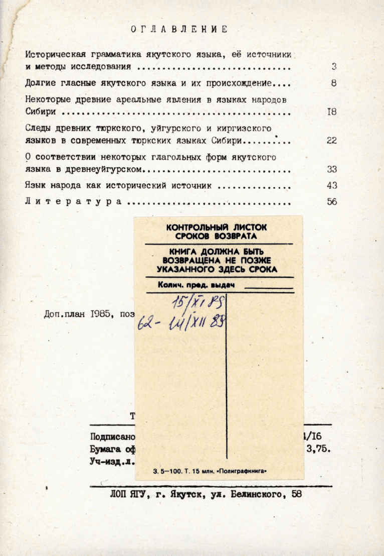 Предлагаемая работа проф. Е. И. Убрятовой издается в качестве учебного пособия для студентов отделения якутского языка и литературы. В ней излагаются некоторые вопросы истории развития и становления фонетических и грамматических норм якутского языка