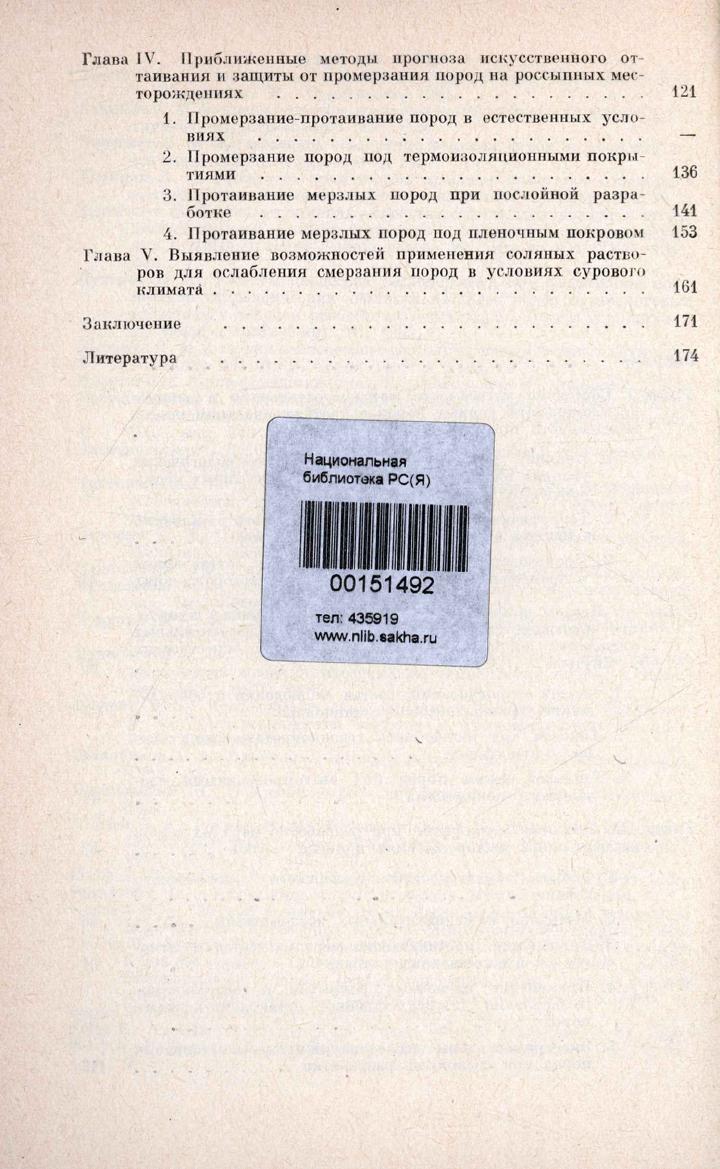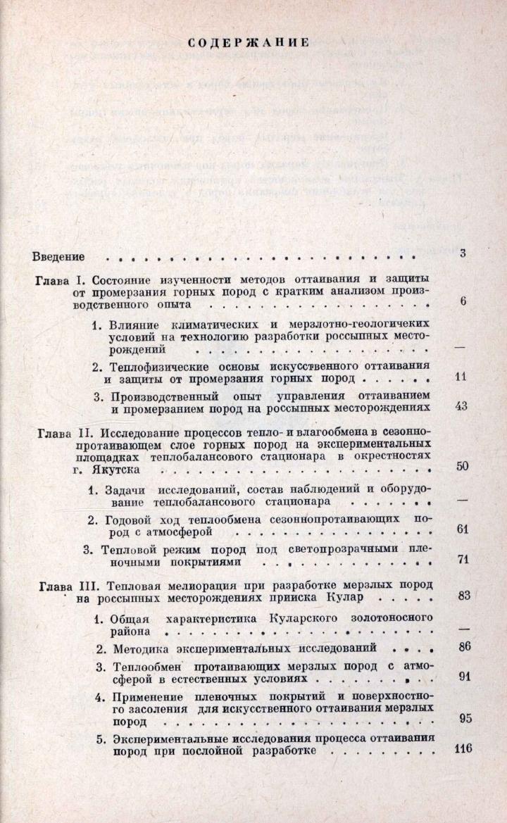 В работе дан анализ современного состояния теории и производственного опыта искусственного оттаивания мерзлых пород и защиты талых пород от промерзания. Основное содержание представляют результаты режимных экспериментальных исследований способов управления промерзанием-протаиванием пород на двух опорных пунктах — в Центральной и Северной Якутии. Детально освещена методика наблюдений за процессами промерзания-протаивания. Рассмотрен годовой ход теплообмена пород с атмосферой на участках с различной подстилающей поверхностью. Изложены результаты изысканий по повышению эффективности методов искусственного оттаивания сильно льдистых россыпей в районе Кулара. Оценена возможность применения растворов солей для искусственного оттаивания и предохранения пород от промерзания. Разработаны новые методики прогноза глубины протаивания пород в естественных условиях, под пленочными покровами и при послойной разработке. Книга рассчитана на широкий круг специалистов, занимающихся изучением теплообмена пород с атмосферой и разработкой способов управления их промерзанием-протаиванием, мерзлотоведов, горняков, строителей