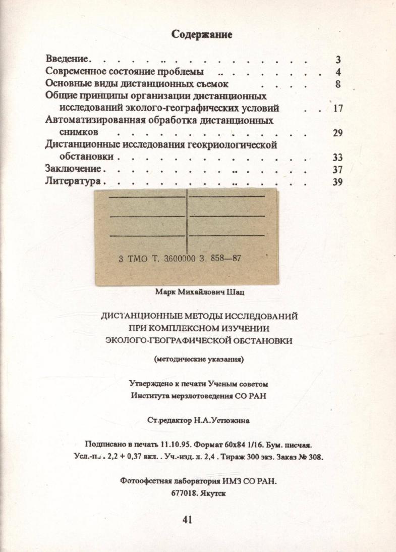 Дистанционные методы исследований при комплексном изучении эколого-географической обстановки : (Метод. указания) / М. М. Шац ; ответственный редактор В. Н. Макаров ; РАН СО Институт мерзлотоведения им. акад. П. И. Мельникова. - Якутск : [б. и.], 1995. - 40 с. : ил., табл.