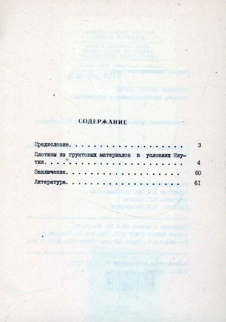 Грунтовые плотины Якутии : пособие проектировщикам и строителям / Р. В. Чжан ; ответственный редактор Г. М. Фельдман ; Академия наук СССР, Сибирское отделение, Институт мерзлотоведения. - Якутск : Институт мерзлотоведения, 1983. - 63 с.