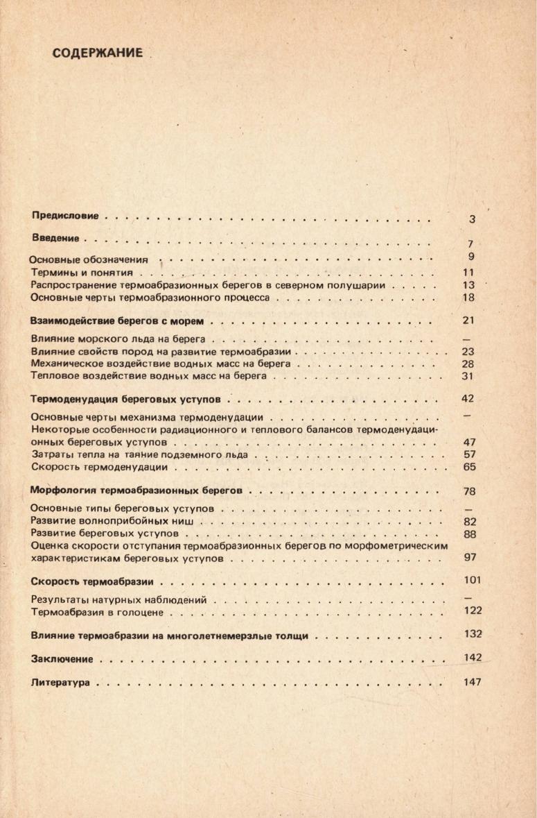 Монография — первое обобщение результатов исследований малоизученного процесса разрушения берегов, сложенных многолетнемерзлыми горными породами. Обобщены сведения об интенсивности развития термоабразии и рассмотрены методы ее количественной оценки по морфометрическим характеристикам береговых уступов и параметрам многолетнемерзлых толщ в береговой зоне и на побережье. Освещены роль термоабразии в формировании арктического шельфа в голоцене и возможности развития некоторых криогенных явлений на дне моря вследствие термоабразии. Работа рассчитана на мерзлотоведов, геологов, географов, океанографов, гидрографов, строителей морских гидротехнических сооружений, специалистов морского транспорта и горного дела, занятых изучением и освоением побережья и прибрежной зоны арктических морей