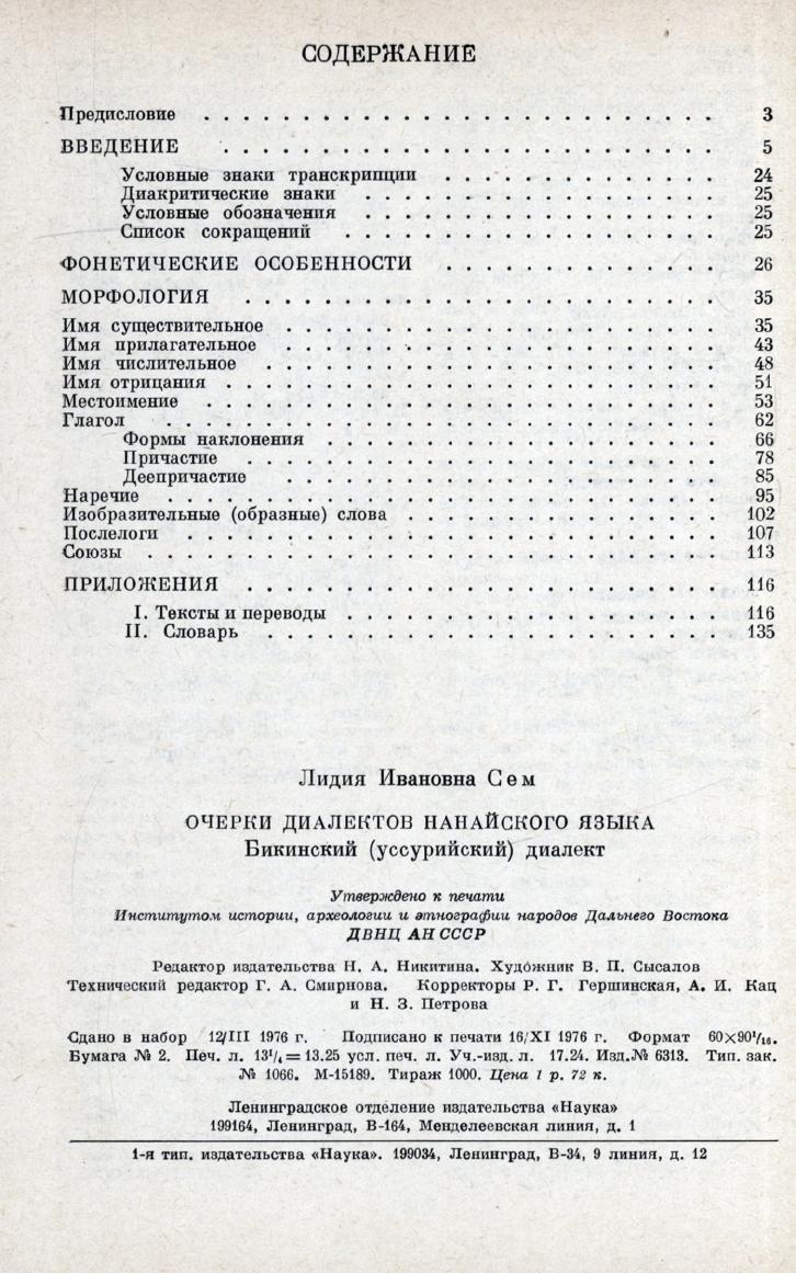 Очерки диалектов нанайского языка : бикинский (уссурийский) диалект / Л. И. Сем ; Академия наук СССР, Дальневосточный научный центр, Институт истории, археологии и этнографии народов Дальнего Востока. - Ленинград : Наука, Ленинградское отделение, 1976. - 210, [2] с.
