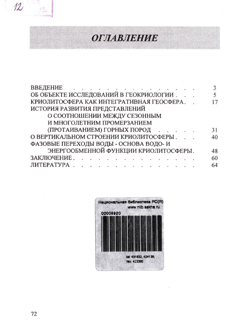 Анализируется роль различных генетических факторов (глобальных, региональных и локальных) в формировании и динамике криолитосферы. Рассматриваются вопросы о вертикальном строении криолитосферы, а также о водо - и энергообменной роли этой криогенно трансформированной части литосферы Земли. Книга рассчитана на специалистов геокриологов, геологов, географов, геоэкологов и историков науки.