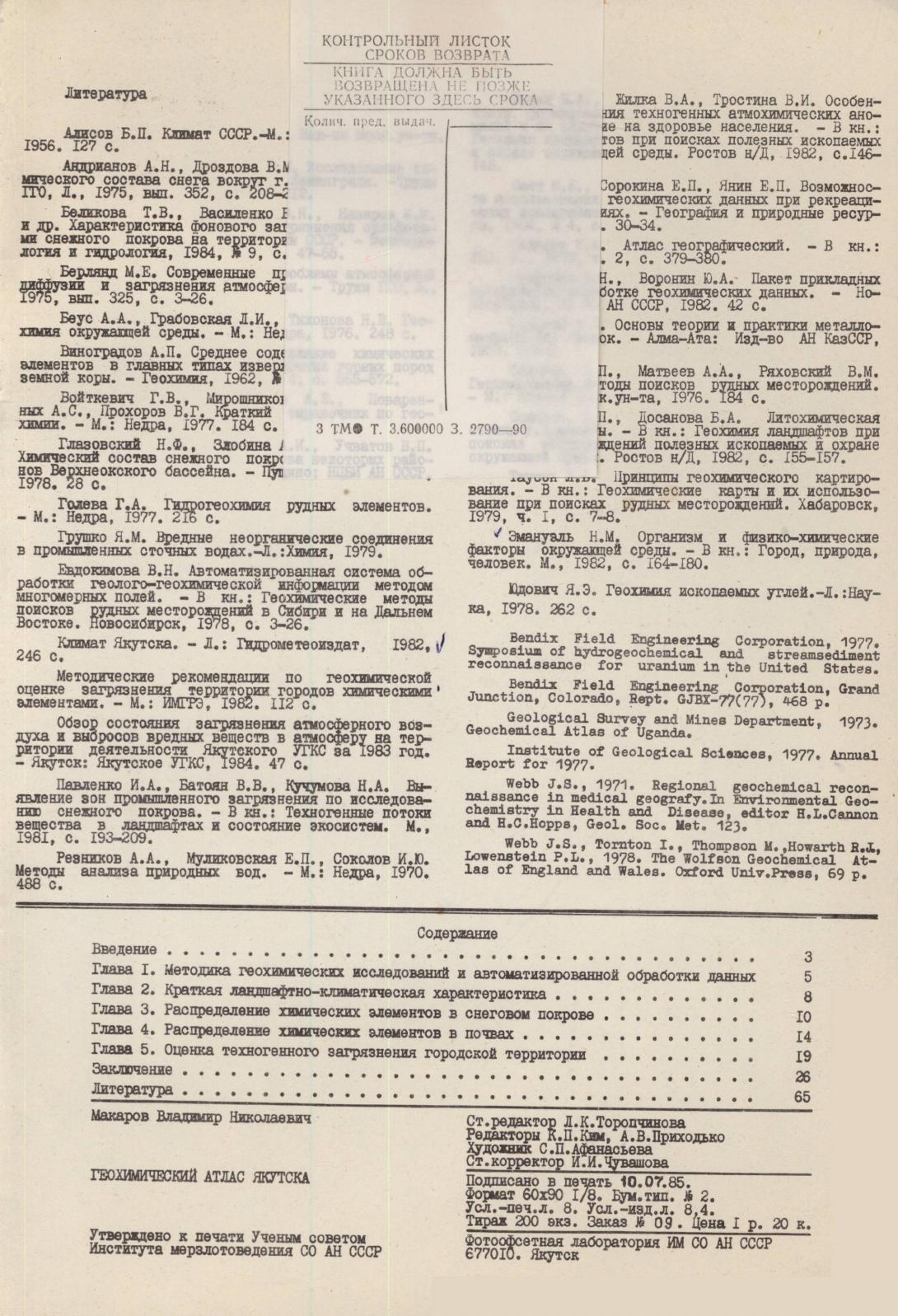 Геохимический атлас Якутска / В. Н. Макаров ; [ответственный редактор академик П. И. Мельников] ; Академия наук СССР, Сибирское отделение, Институт мерзлотоведения. - Якутск : ИМ СО АН СССР, 1985. - 64 с.