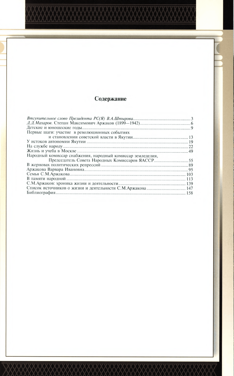 Степан Максимович Аржаков (1899-1942) : фотографии, документы / Респ. организац. ком. по подгот. и проведению 110-летнего юбилея С. М. Аржакова, Ком. гос. архив. службы Респ. Саха (Якутия), ГУ "Нац. арх. Респ. Саха (Якутия)", МР "Вилюй. улус (р-н)" РС(Я) ; [сост.: А. А. Калашников, Н. Н. Малышева, М. М. Степанова]. - 2-е доп. изд. / подгот. А. А. Калашников. - Якутск : Бичик, 2009. - 158, [1] с.