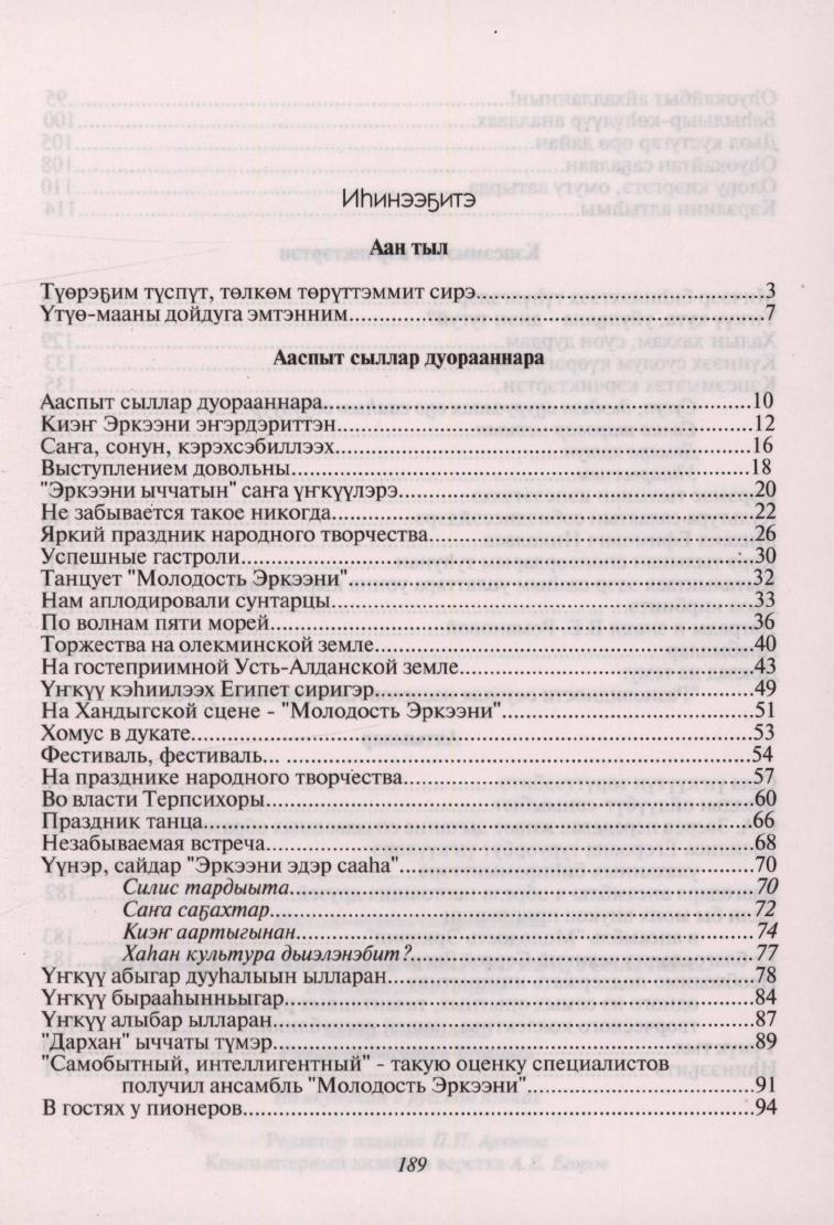 Книга написана бессменным руководителем народного ансамбля танца "Молодость Эркээни". В книгу вошли все заметные моменты жизни этого замечательного коллектива, которая побывала во многих государствах и восхищала зрителей своим умением исполнения народных танцев