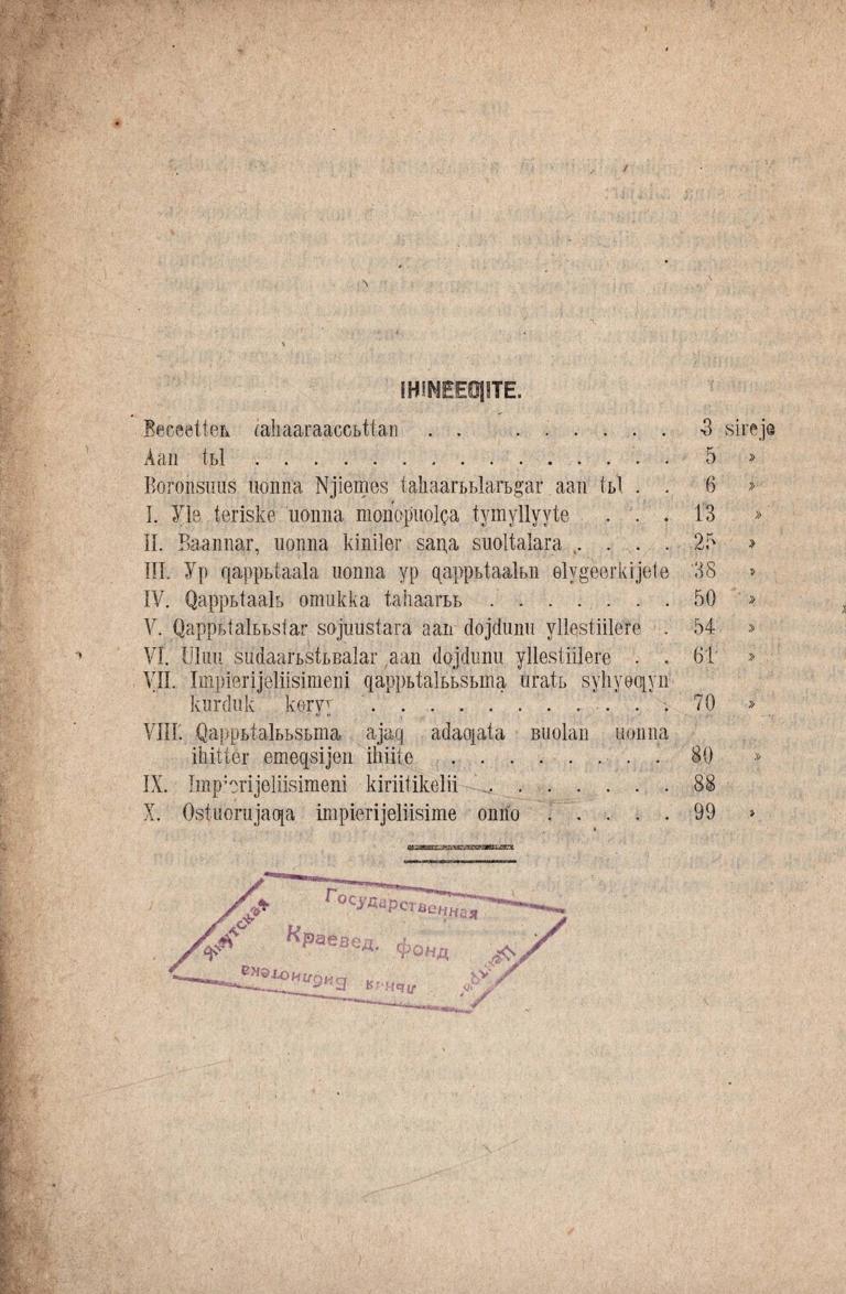Импэрилиисими хаппыталыысыма сайдыытын үрдүкү сүһүөҕүн курдук көрүү / Б. Ы. Лиэньин ; С. И. Ондуруоһап тылб. - Дьокуускай : Саха судаарыстыбатын кинигэтин бэчээтэ, 1930. - 103 [1], с. ; 21 см. - 3000 экз.