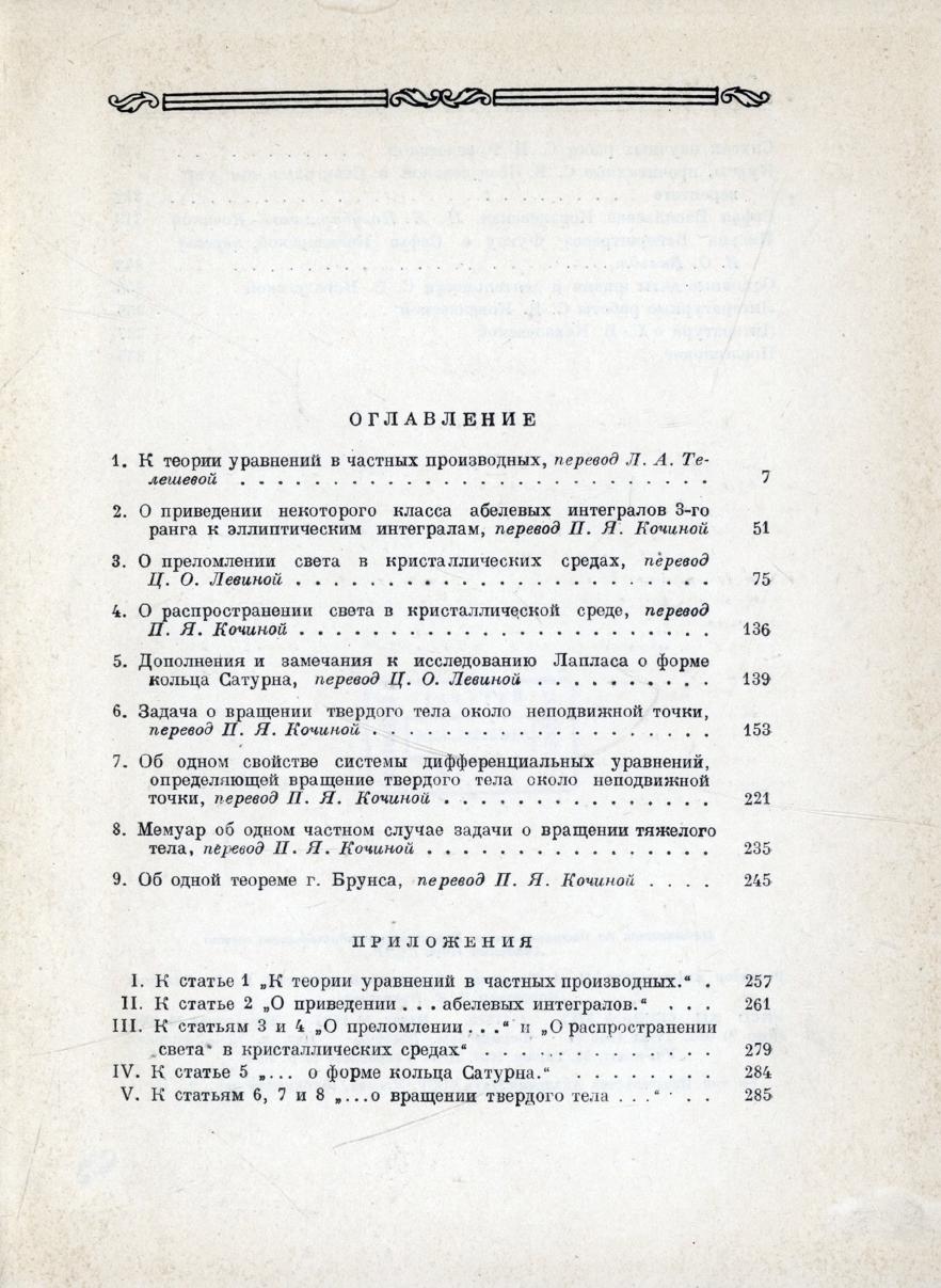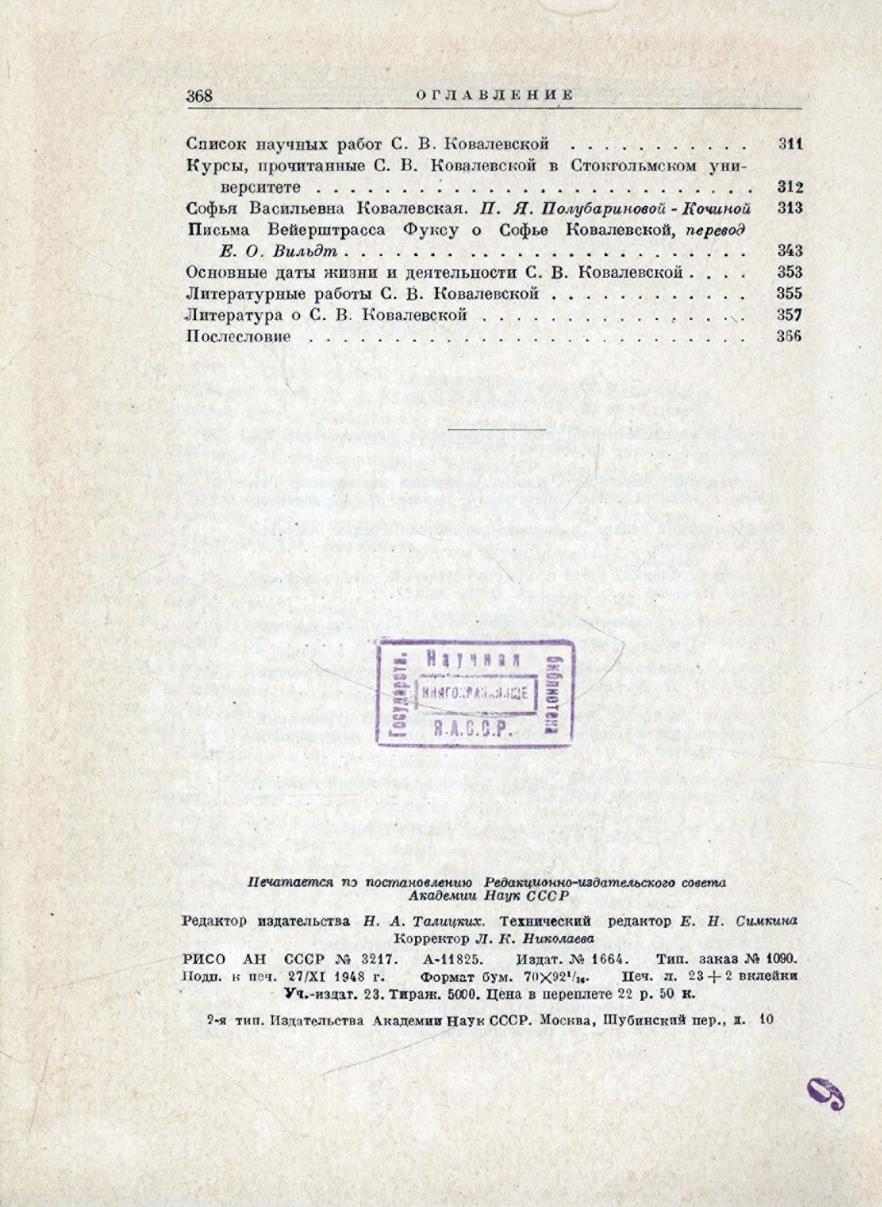 Научные работы / С. В. Ковалевская ; редакция и комментарии [и статья"Софья Васильевна Ковалевская. Очерк научной деятельности", с.313-342] П. Я. Полубариновой-Кочиной. - Москва : Издательство Академии наук СССР, 1948. - 368 с.,2 л. портр. : портр. ).