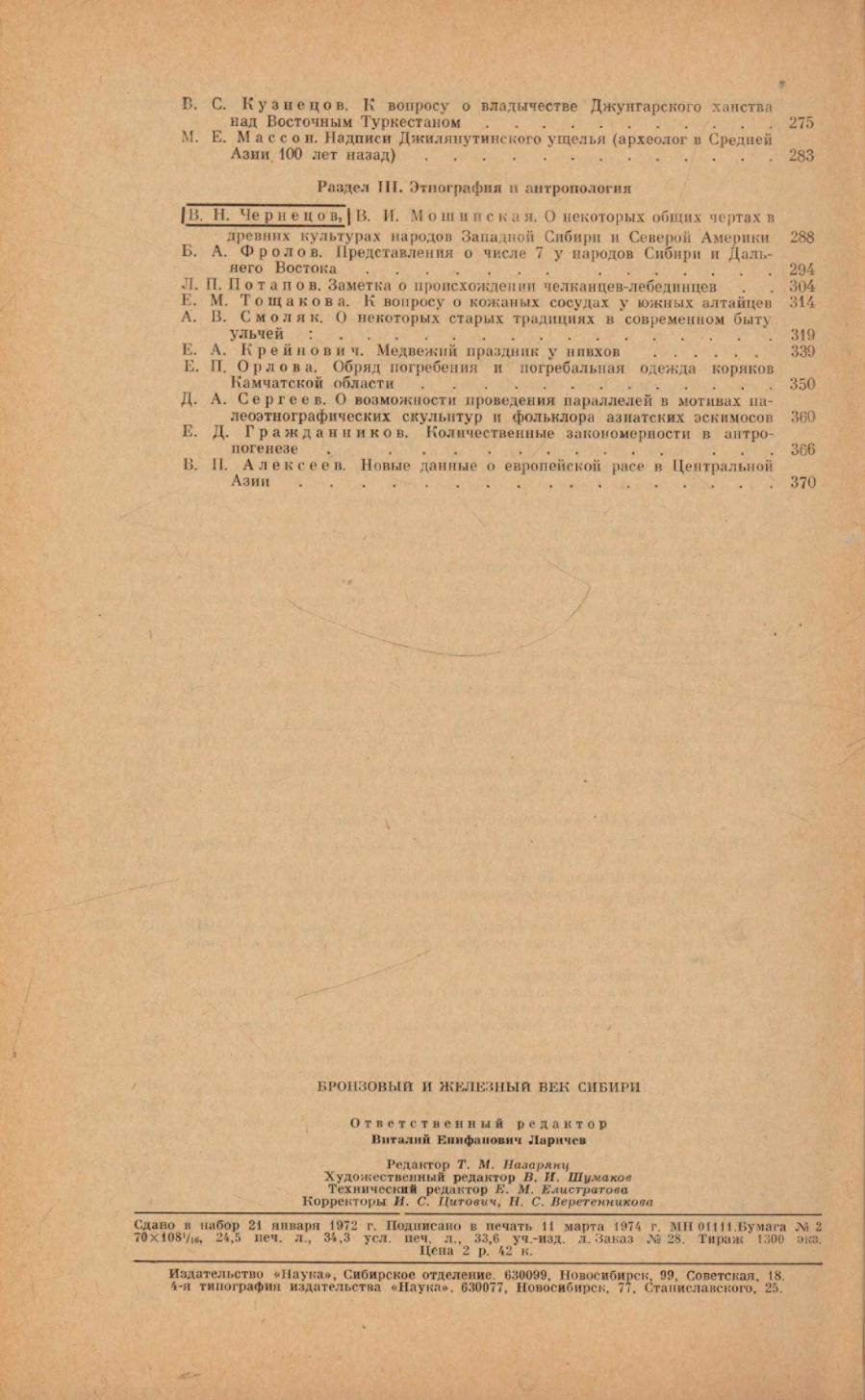 Бронзовый и железный век Сибири / Академия наук СССР, Сибирское отделение, Институт истории, филологии и философии ; [ответственный редактор В. Е. Ларичев]. - Новосибирск : Наука, Сибирское отделение, 1974. - 391 с.
