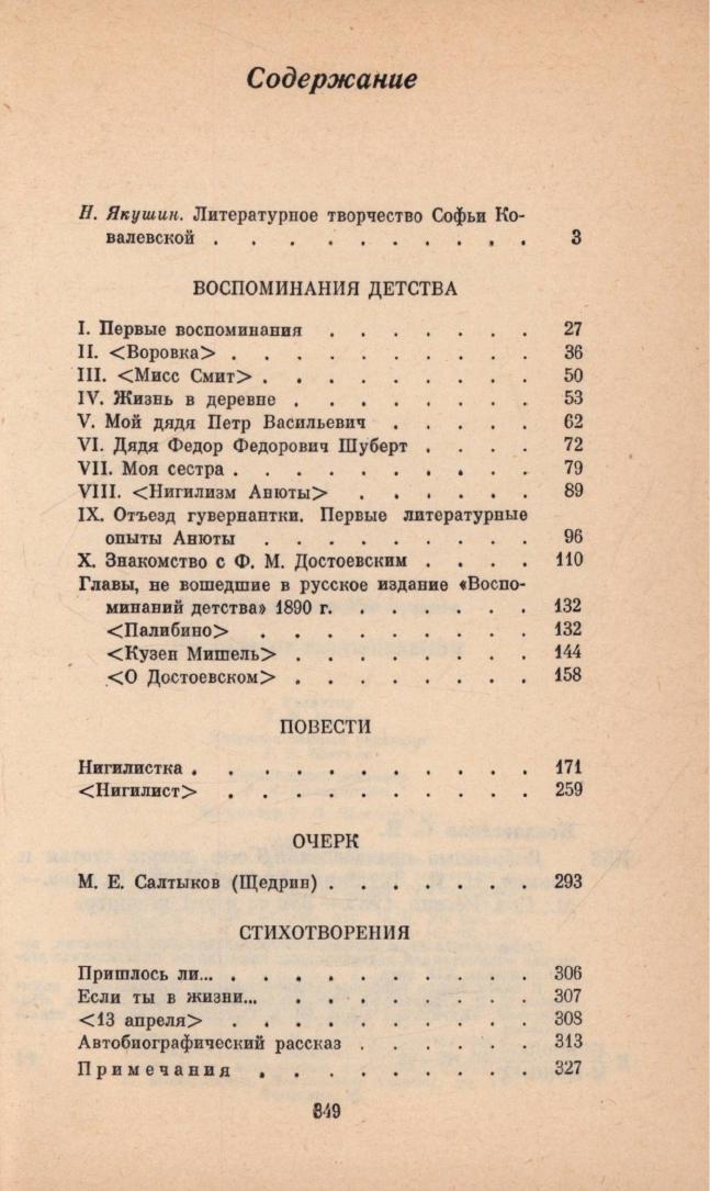 В книгу вошли основные художественные произведения, написанные С. В. Ковалевской: «Воспоминания детства», повести «Нигилистка», «Нигилист», очерк «М. Е. Салтыков (Щедрин)», стихотворения