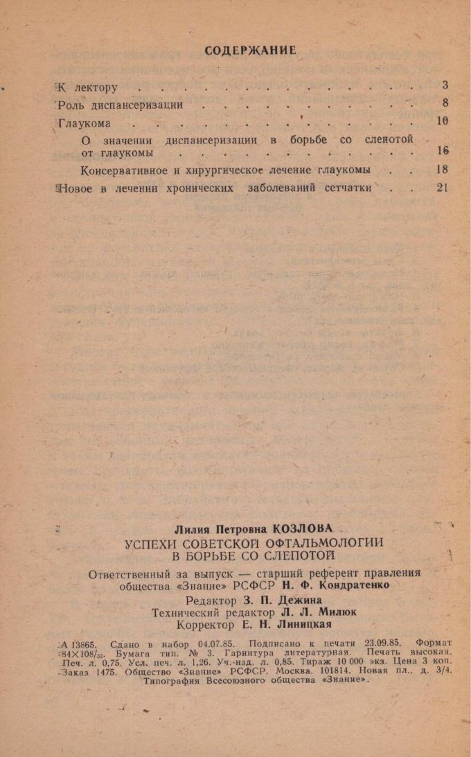 Успехи советской офтальмологии в борьбе со слепотой : в помощь лектору / Л. П. Козлова ; Общество "Знание" РСФСР, Научно-методический совет отделения по пропаганде биологических и медицинских наук. - Москва : Общество "Знание" РСФСР, 1985. - 24 с.